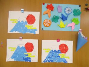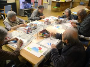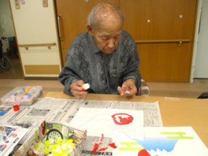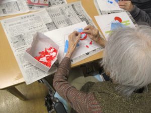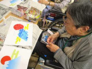 手指の運動と頭の体操を兼ねて入居者の皆さんと富士山のちぎり絵を作りました👌